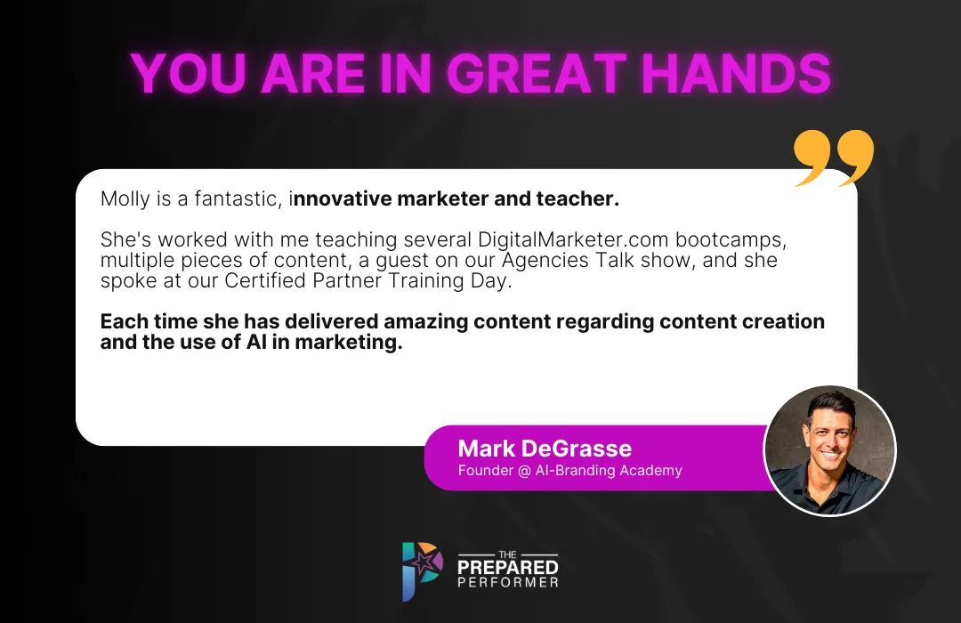 Molly has been featured by Be.live, ManyChat, Social Media Marketing World, Traffic & Conversion Summit, Perry Belcher's Ai Bot Summit, Rich Schefren's Steal our Winners, Inc magazine, Forbes, Entrepreneur and more.